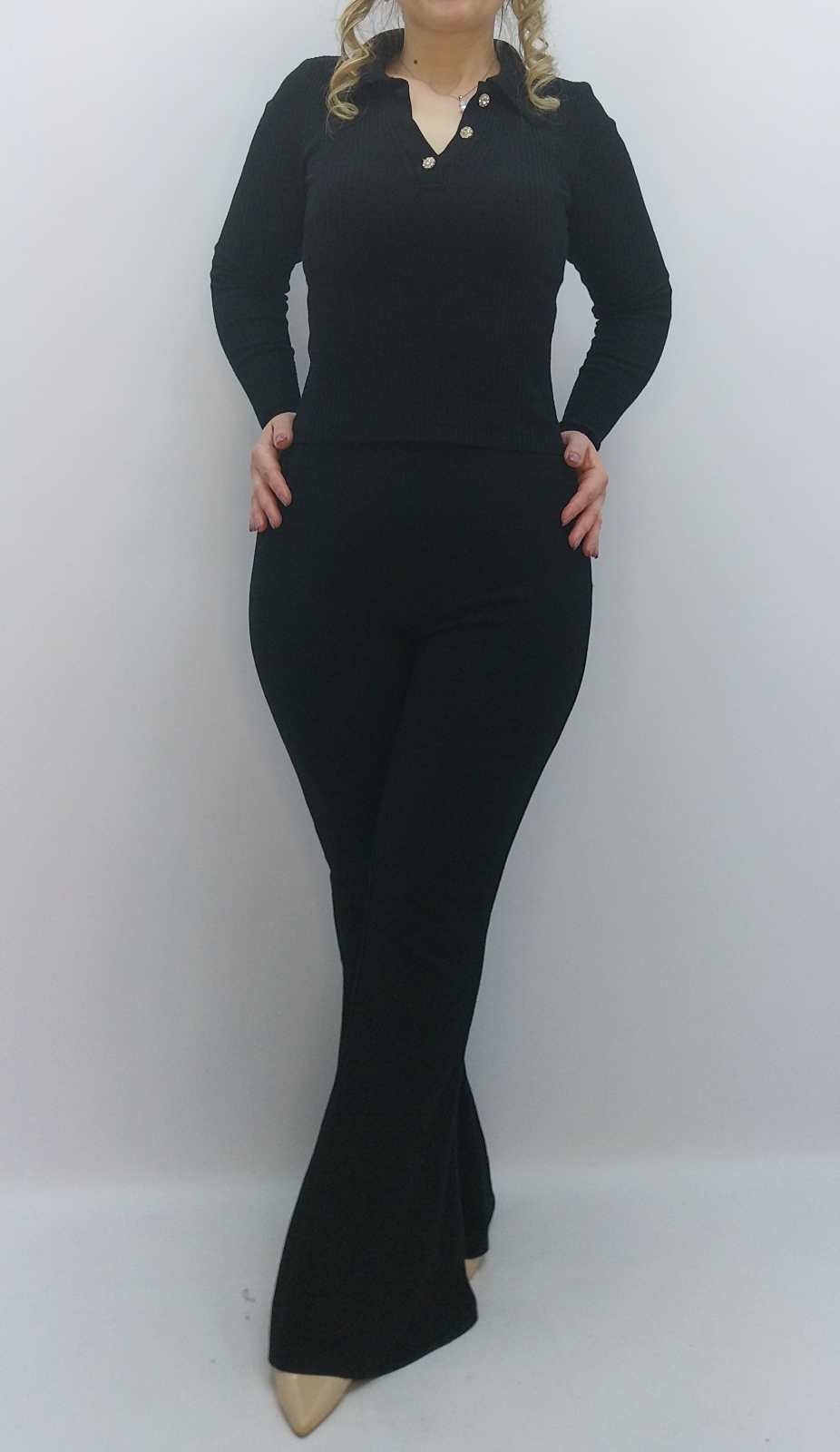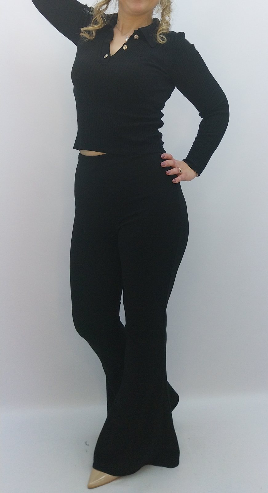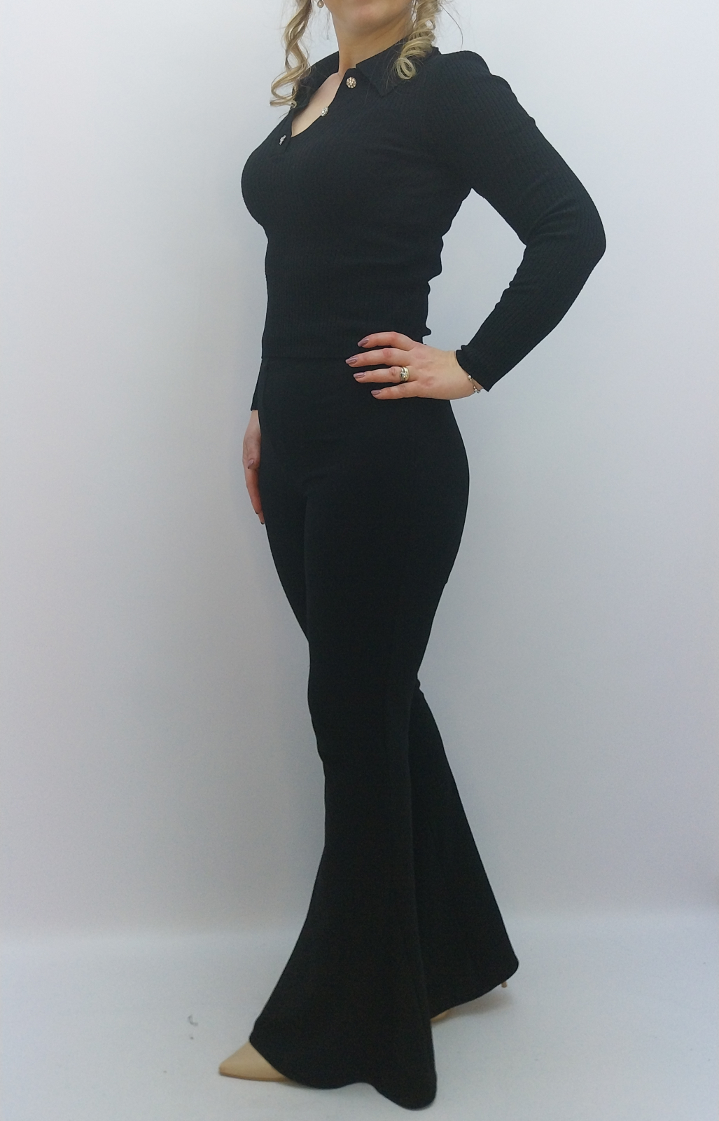 Pantalonul  este confectionat dintr-o stofa elastica, este slim pana la genunchi si evazat de la genunchi in jos.