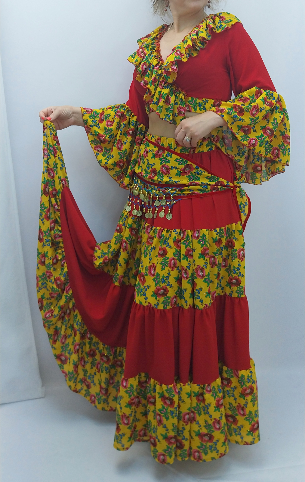 Acest costum dans țigănesc damă este un ansamblu spectaculos inspirat din stilul tradițional al costumelor de dans. Modelul este format din fustă amplă cu imprimeu floral și top roșu decorat cu același material floral, creând un efect vizual vibrant și plin de energie.