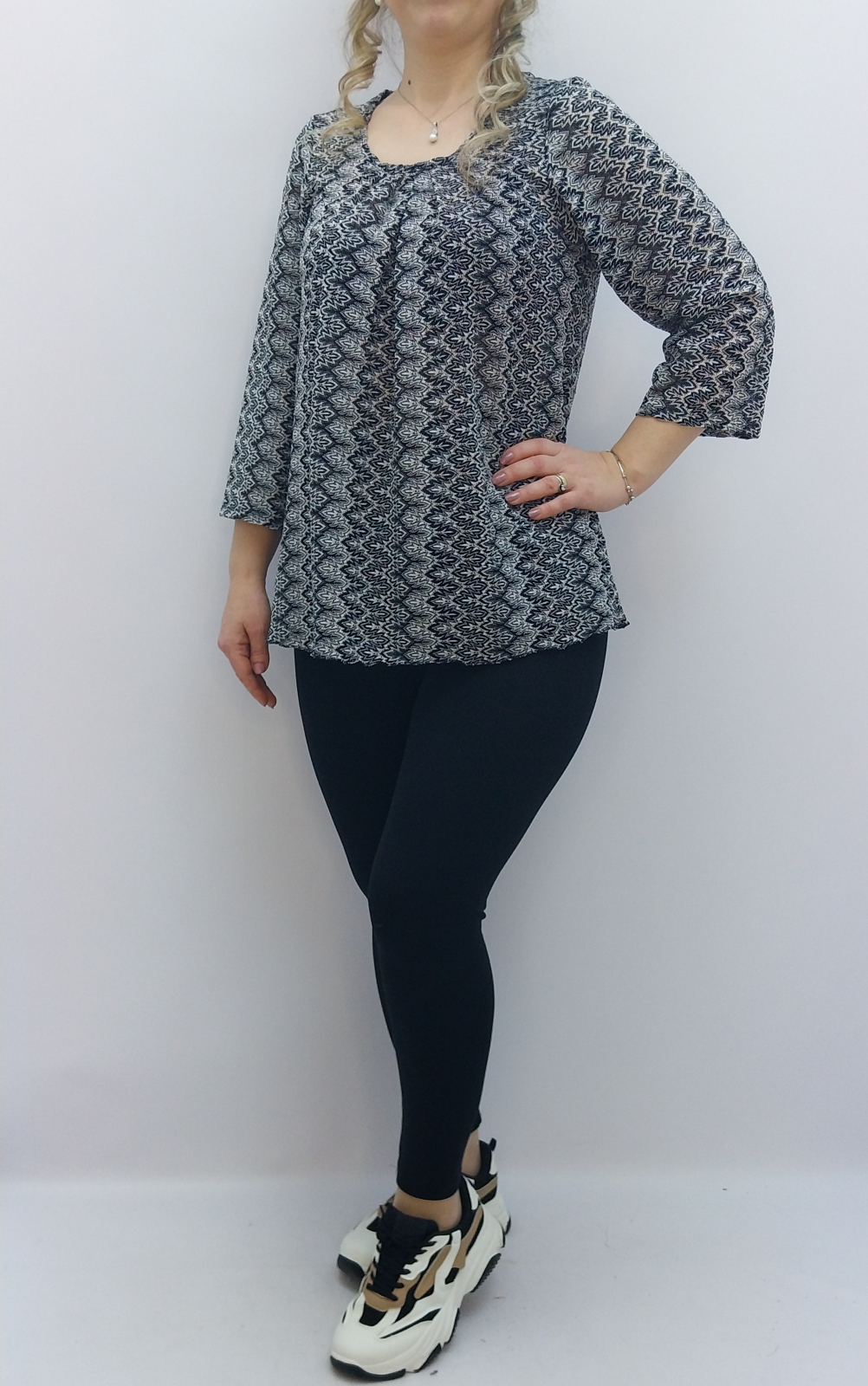 BLUZA CONFECTIONATA DINTR-UN TRICOT PLINUT CU DECOLTEU ROTUND SI PLIURI SI MANECI TREISFERTURI . BLUZA ARE UN CROI LEJER