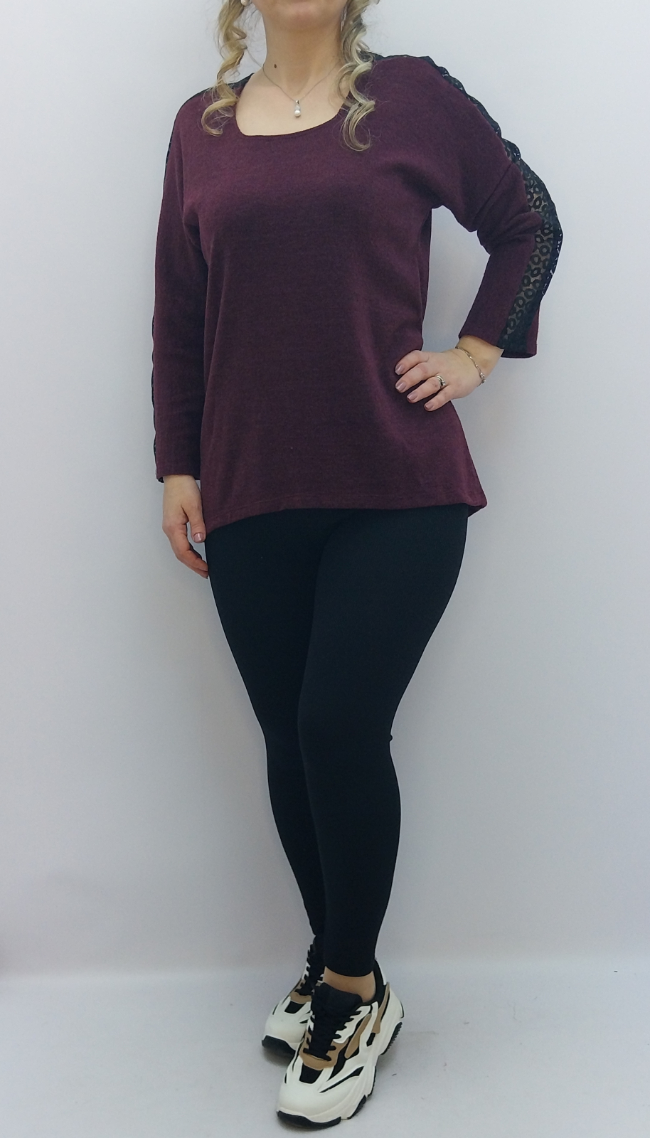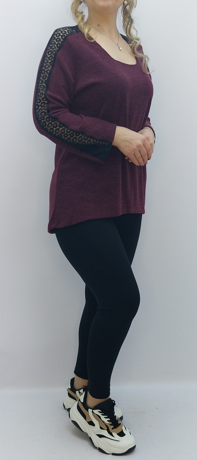 Bluză damă mov cu design modern și detaliu elegant de dantelă neagră aplicată din zona umerilor pe mâneci. Modelul combină stilul casual cu accente feminine rafinate, fiind potrivit pentru ținute de zi, birou sau întâlniri informale.