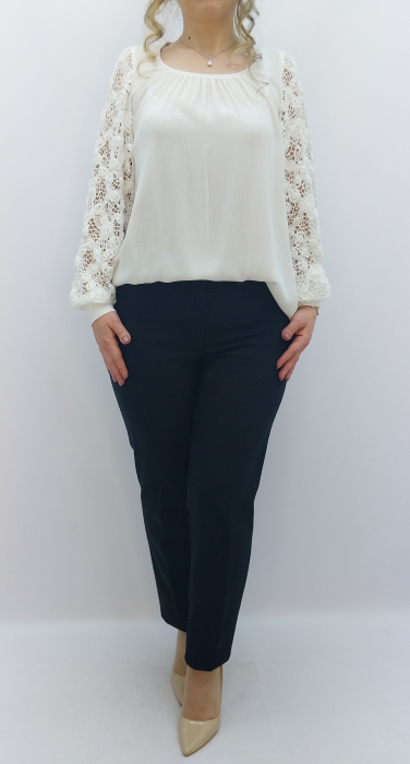 Bluză damă elegantă din vâscoză tip pânză topită, cu mâneci lungi din dantelă delicată. Model feminin și rafinat, realizat în atelierul DADAS din Constanța, potrivit pentru ținute elegante, office sau casual chic.