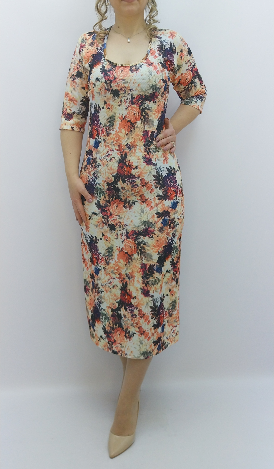 Materialul jerse fin este moale, elastic și confortabil, adaptându-se perfect formelor. Imprimeul floral multicolor, în nuanțe calde de roșu, bej și bleumarin, creează un efect vizual vibrant, dar elegant. Decolteul rotund discret și mânecile trei sferturi completează designul, oferind versatilitate și rafinament. Lungimea midi face această rochie potrivită atât pentru pantofi eleganți, cât și pentru ținute smart-casual.