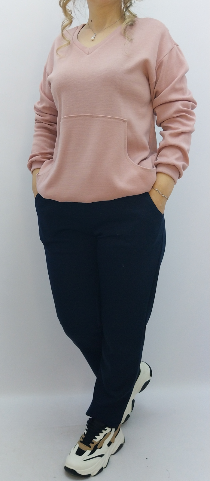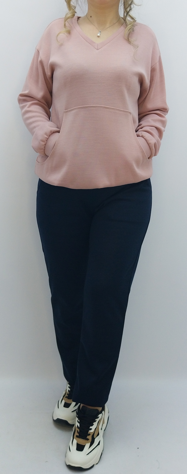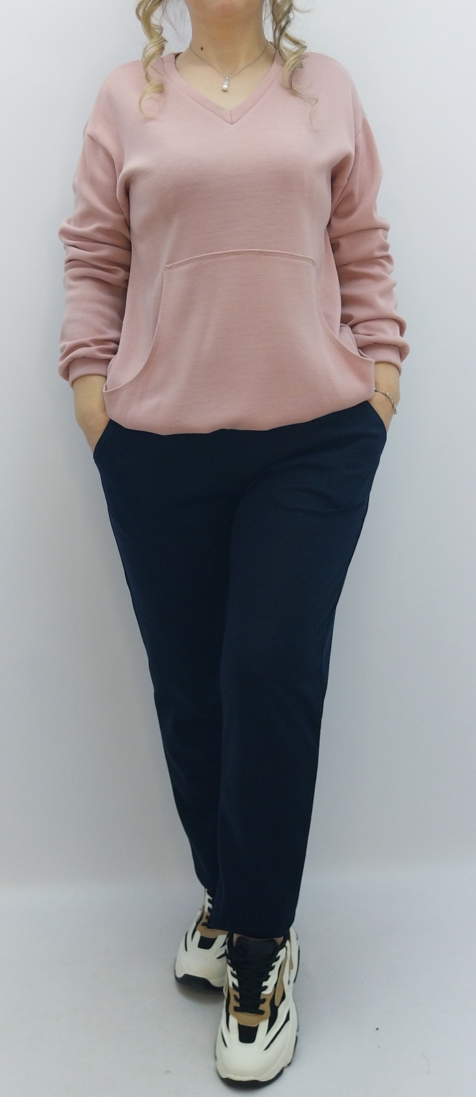Bluza roz pudrat are croială lejeră, decolteu discret în V și mâneci lungi. Linia ușor coborâtă a umerilor oferă aspect relaxat, iar materialul moale și plăcut la atingere asigură confort pe tot parcursul zilei. Pantalonul bleumarin are croială conică, talie confortabilă și buzunare laterale funcționale, conturând o siluetă echilibrată.