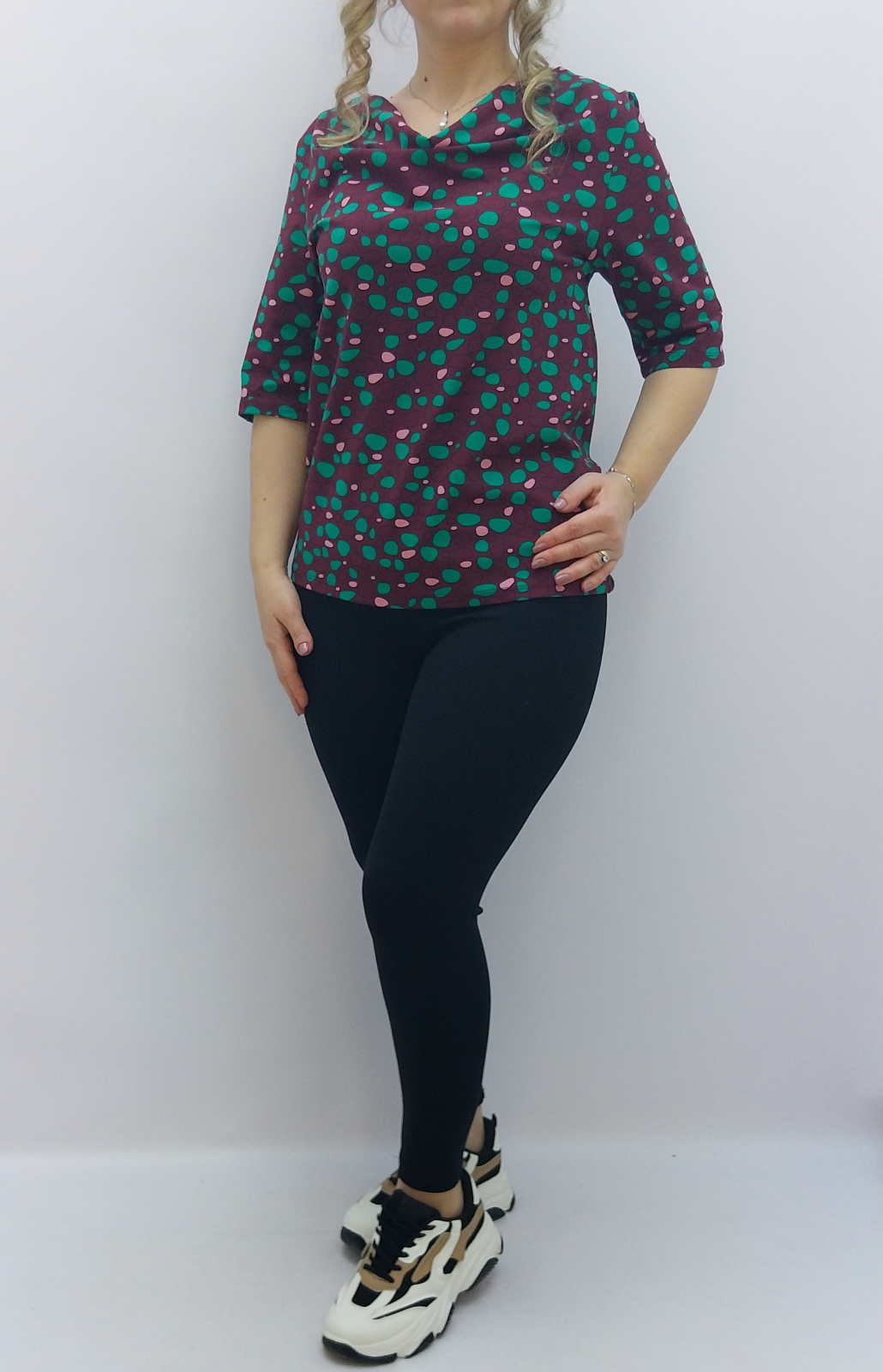 BLUZA CONFECTIONATA DINTR-UN TRICOT DE CALITATE VISINIU CU BULINUTE INEGALE VERZI. BLUZA ARE UN CROI PE LANGA CORP SPRE LEJER MANECI TREISFERTURI SI DECOLTEU IN VOLAN