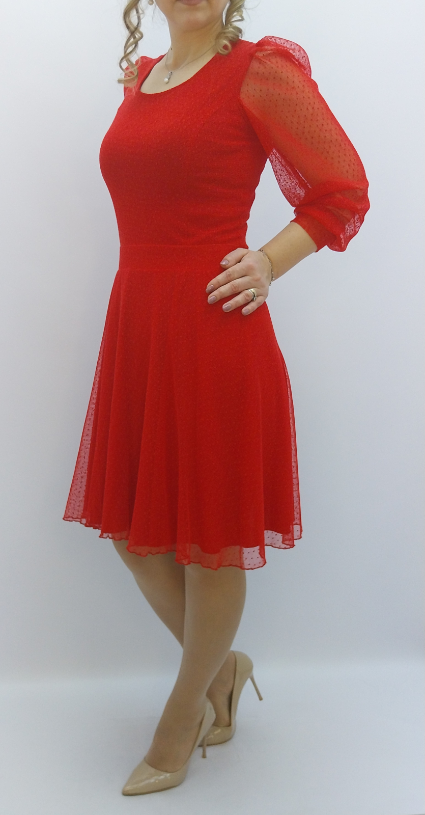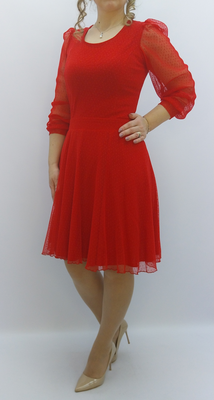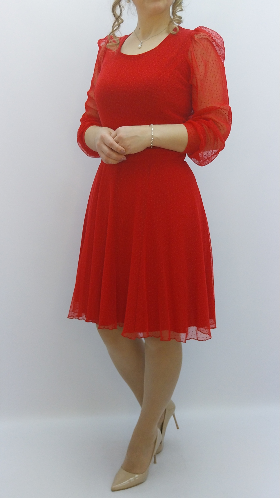 Rochie damă roșie elegantă din plasă cu picouri (buline) mici, realizată în atelierul propriu DADAS din Constanța. Această rochie damă fabricată în România îmbină eleganța cu confortul, fiind potrivită pentru evenimente, petreceri, aniversări sau ținute office elegante.