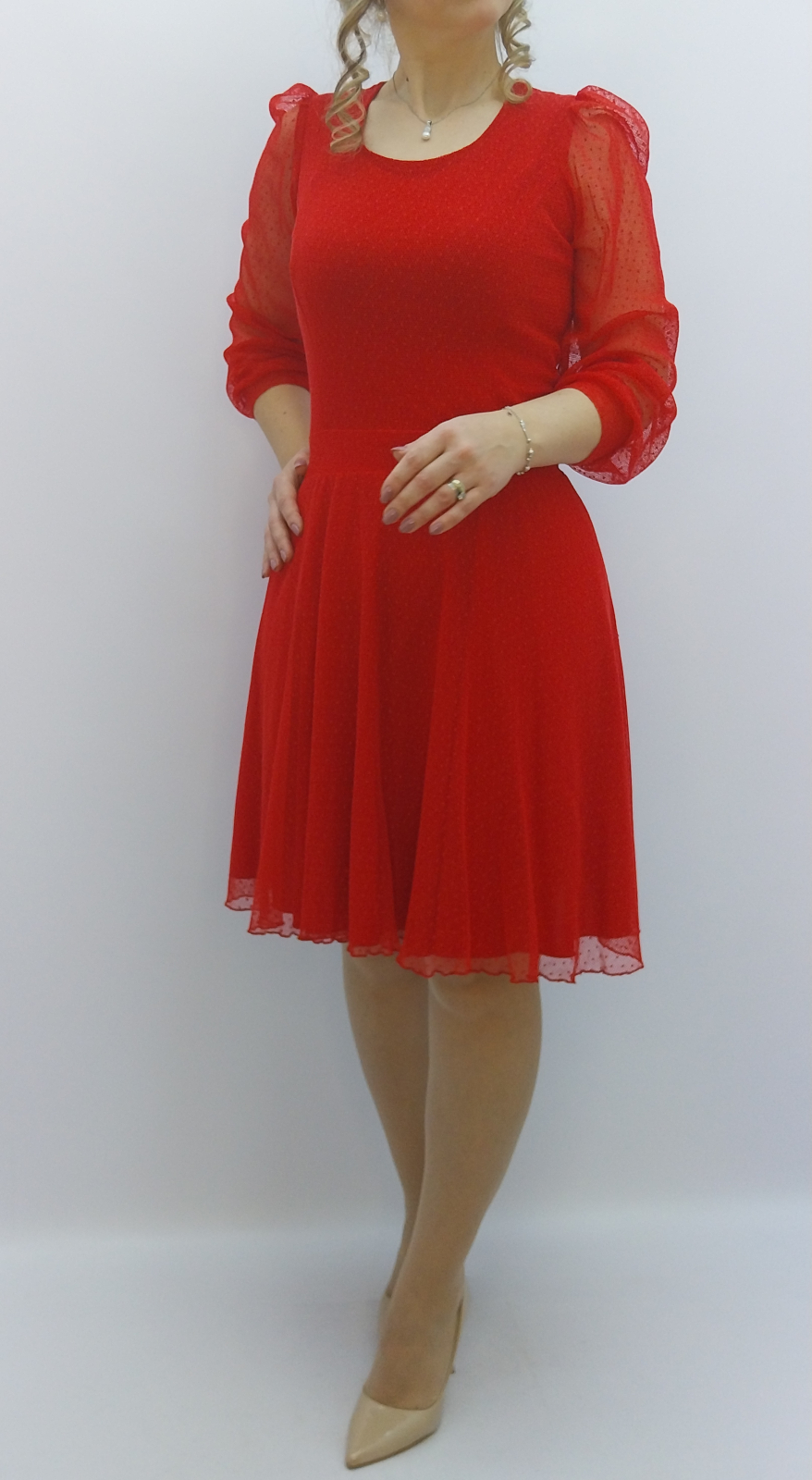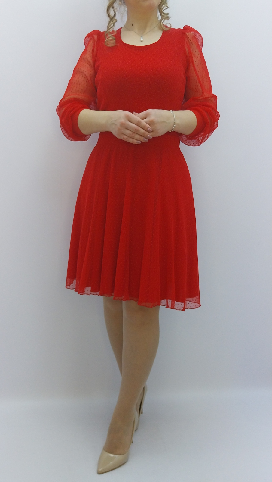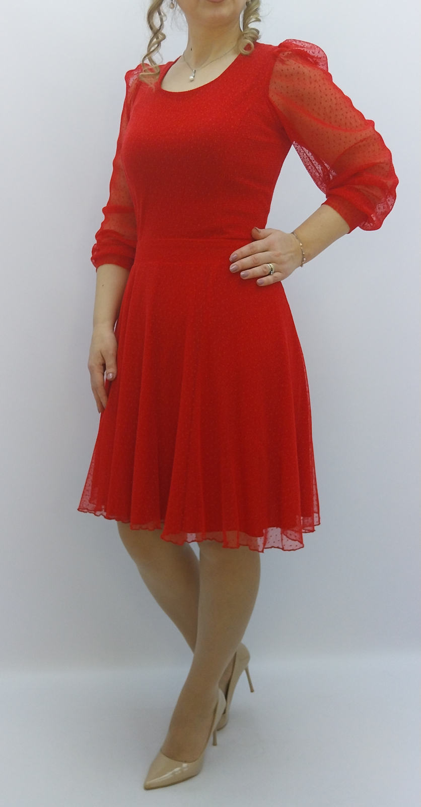 Rochie damă roșie elegantă din plasă cu picouri (buline) mici, realizată în atelierul propriu DADAS din Constanța. Această rochie damă fabricată în România îmbină eleganța cu confortul, fiind potrivită pentru evenimente, petreceri, aniversări sau ținute office elegante.