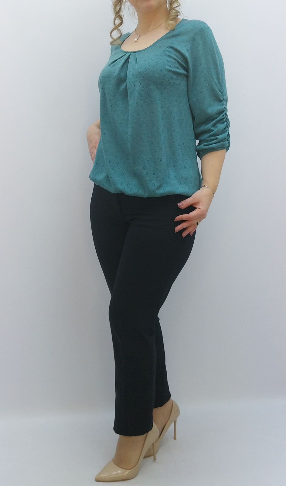 Bluză turcoaz rafinată pentru damă, cu detalii de pliuri elegante la decolteu și mâneci trei sferturi. O piesă versatilă, produsă în România de Dadas (fondat 2002), ideală pentru mărimi mari și ținute office de înaltă calitate si confort.