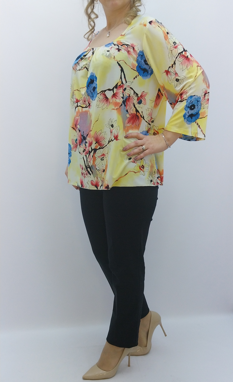 Bluza galbena cu flori diverse culori, confectionata din licra cu pliuri la decolteu si maneci trei sferturi.