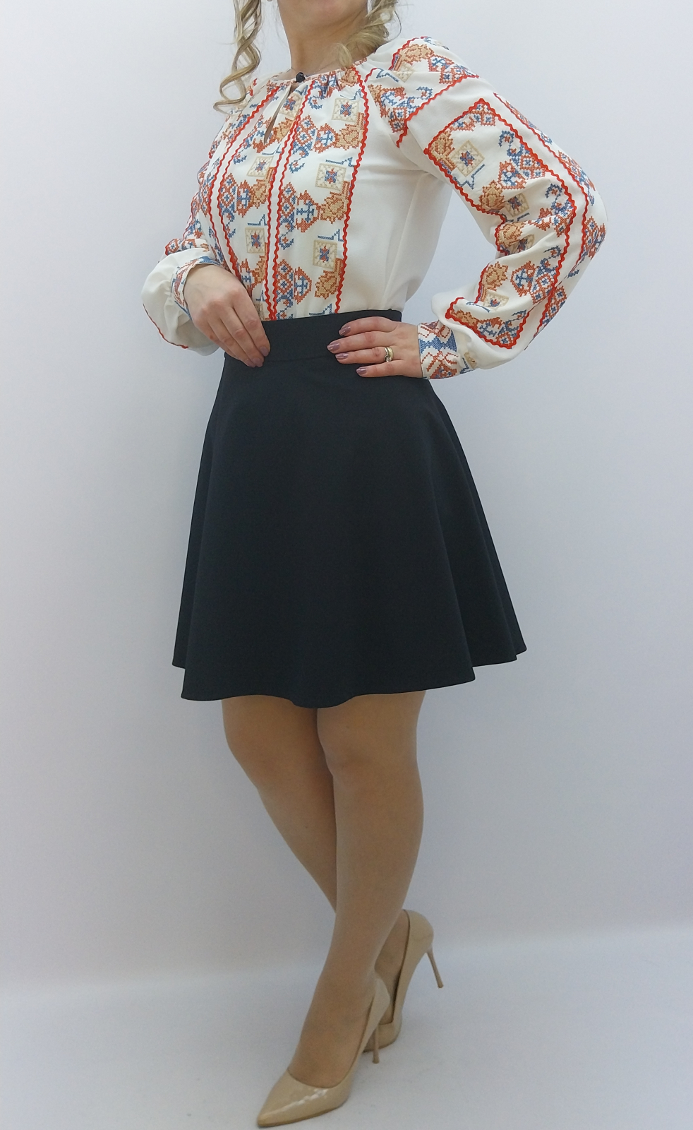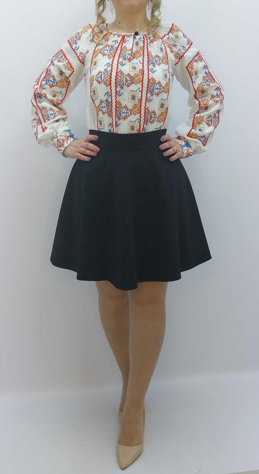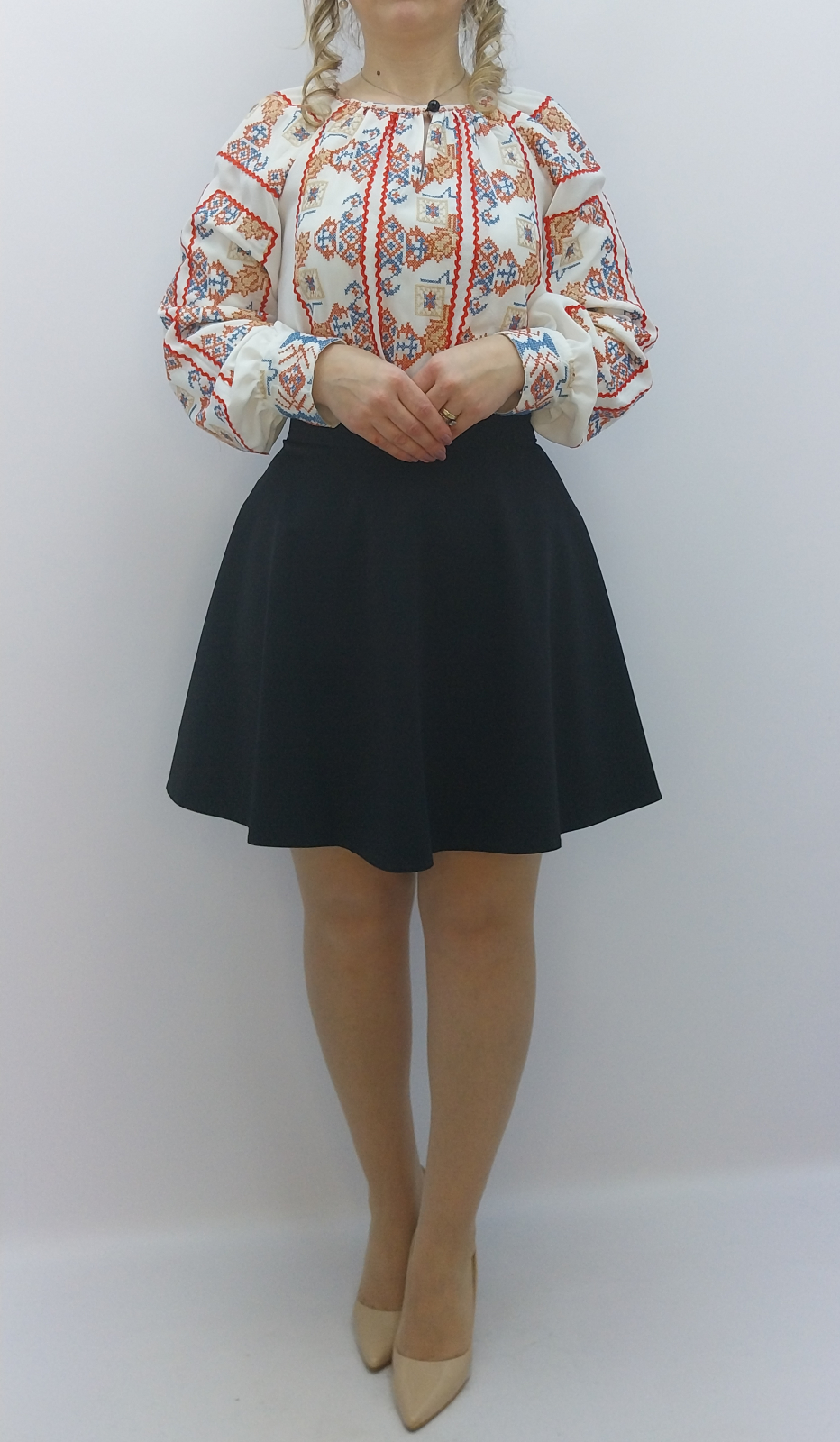 IE TRADITIONALA POPULARA STILIZATA CU ROSU SI ALBASTRU CONFECTIONATA DINTR-O PANZA STIL CREP CU MODEL TRADITIONAL POPULAR STILIZAT APLICAT. ESTE TERMINATA LA DECOLTEU INTR-O BENTITA TIP PASPOAL CU NASTURE SI BRIDA IAR MANECILE SE TERMINA INTR-O MANSETA CU BRIDE SI NASTURI.