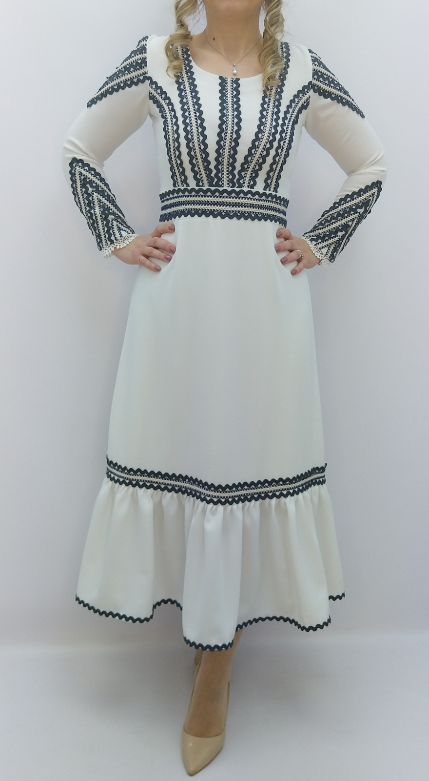 ROCHIE TRADITIONALA POPULARA STILIZATA,CONFECTIONATA DIN CREP ALB USOR IVOIRE, CU BENZI TRADITIONALE APLICATE, DECOLTEU ROTUND, MANECI PE LANGA CORP CU MODEL APLICAT, FUSTA CU VOLAN ADAUGAT SI CAPTUSITA. MODELUL TRADITIONAL APLICAT PE BUST, MANECI SI POALE ESTE DE CULOARE ALBASTRU SPRE GRI. LA SPATE ESTE PREVAZUTA CU FERMOAR ASCUNS.