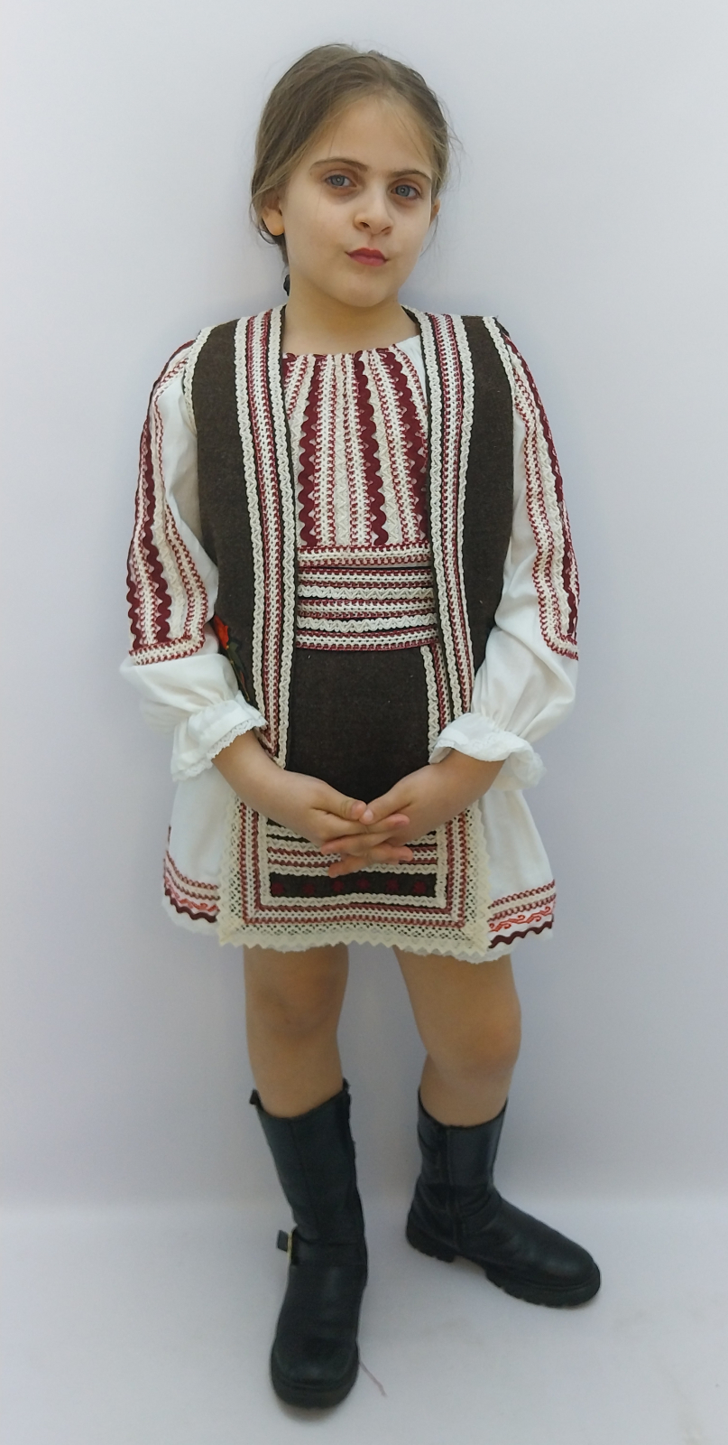COSTUM TRADITIONAL POPULAR STILIZAT COMPUS DIN IE CU MODEL TRADITIONAL APLICAT, VESTA SI FOTE CONFECTIONATE DINTR-O STOFA DE CASA MARO SI FUSTA ALBA