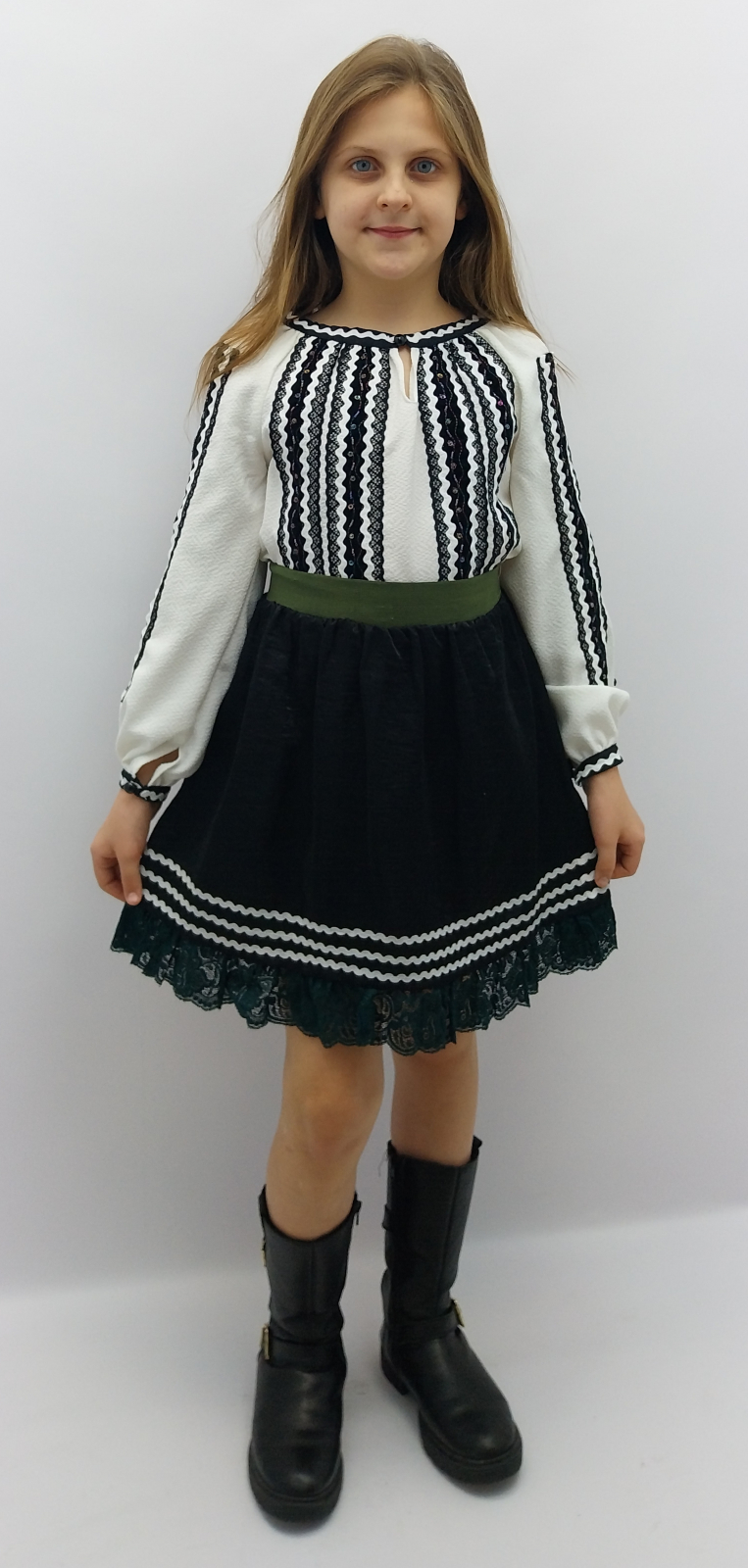 CONSTUM TRADITIONAL POPULAR STILIZAT COMPUS DIN IE CONFECTIONATA DIN CREP CU MODEL APLICAT SI FUSTA  CU DANTELA SI ZIG ZAG APLICAT