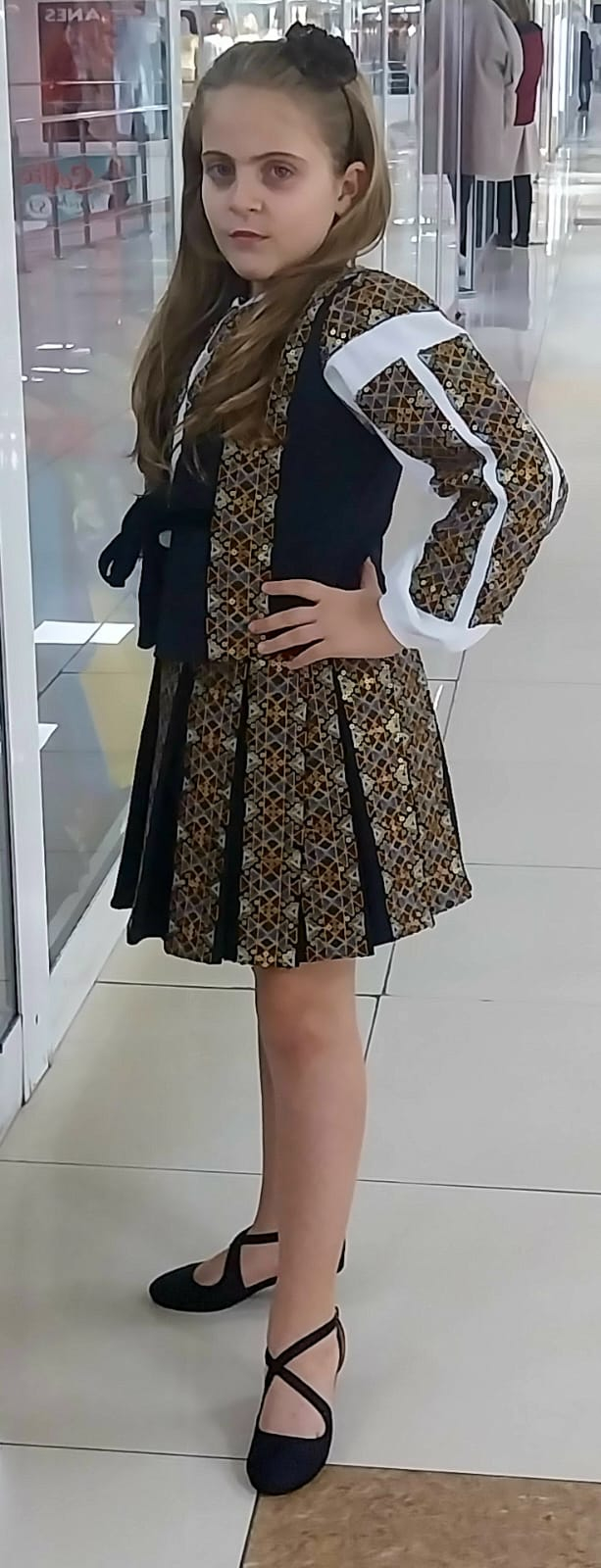 Costumul este compus din fusta plisata petrecuta, ie confectionata din crep si cu model aplicat si vesta din stofa care se inchide cu 2 panglici de catifea.