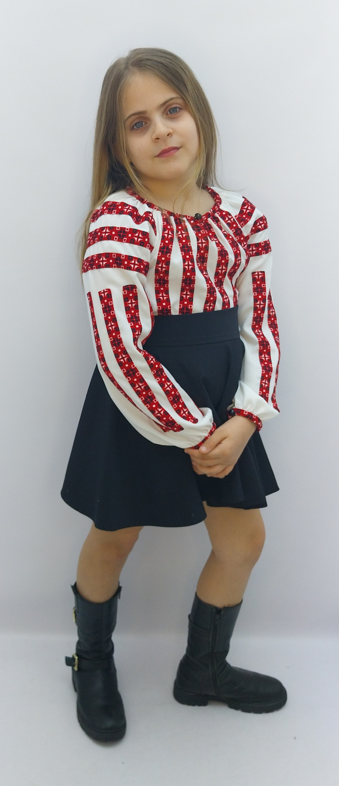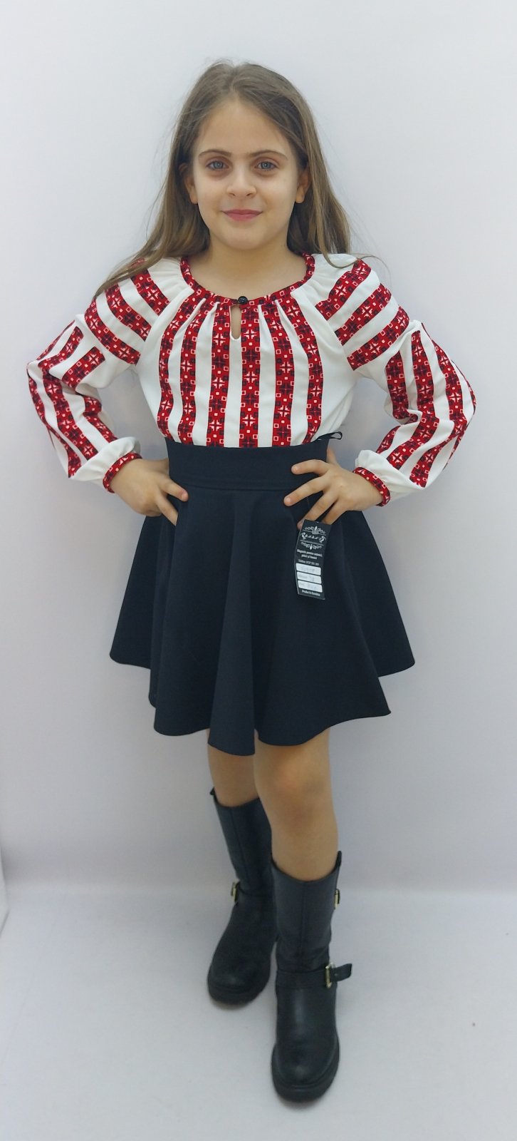IE TRADITIONAL POPULARA STILIZATA CU MODEL APLICAT CONFECTIONATA DIN CREP DE CALITATE, LA DECOLTEU TERMINATA INTR-O BENTITA, CU MANECI LUNGI SI BENTITA CU NASTUREL LA FINAL.