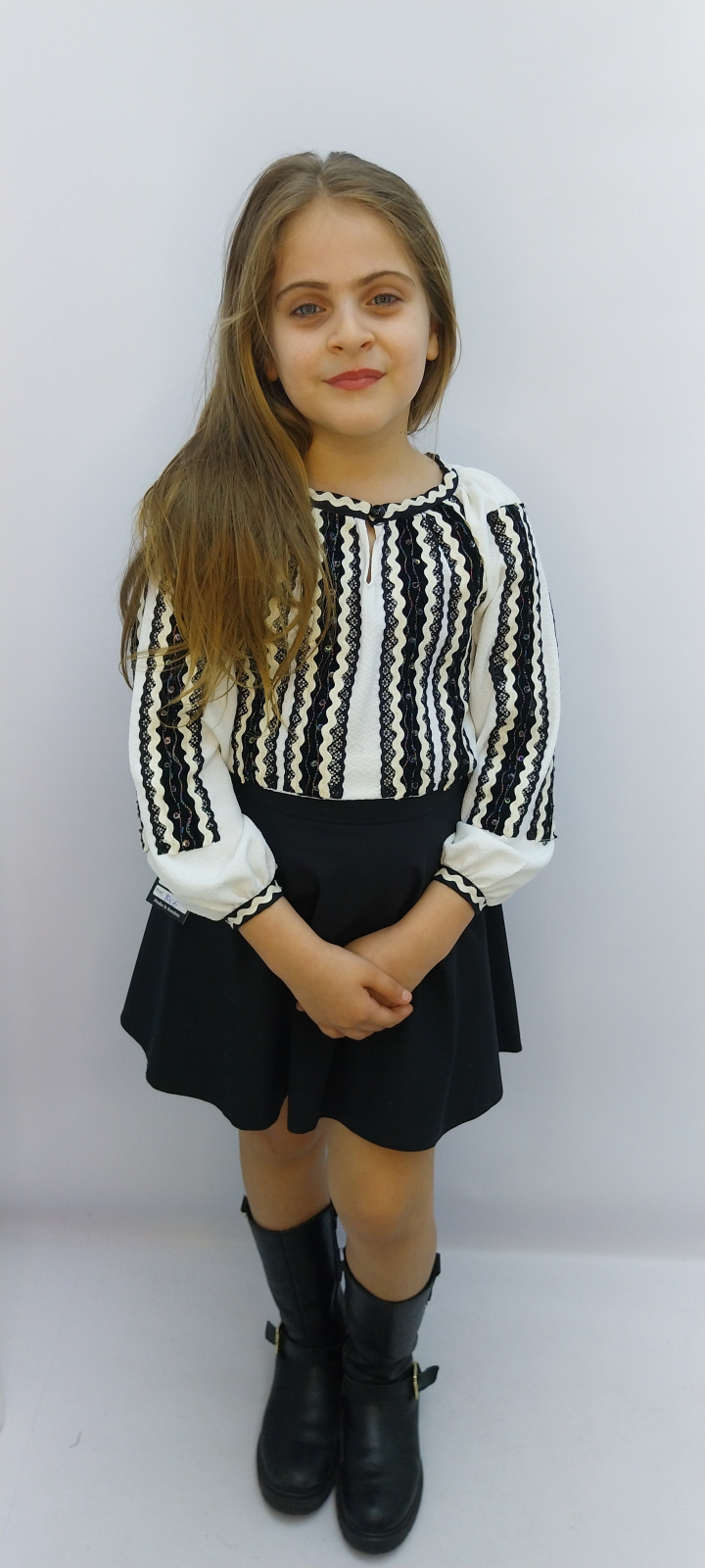 Produsul surprinde frumusețea autentică a tradițiilor românești, reinterpretate într-o variantă modernă, perfectă pentru a fi purtată de către fetițe la diferite evenimente, serbări sau chiar ca ținută de zi cu zi. Ia este elementul central al costumului, combinată armonios cu o fustiță neagră modernă și cizme elegante, pentru un aer contemporan și plin de rafinament.